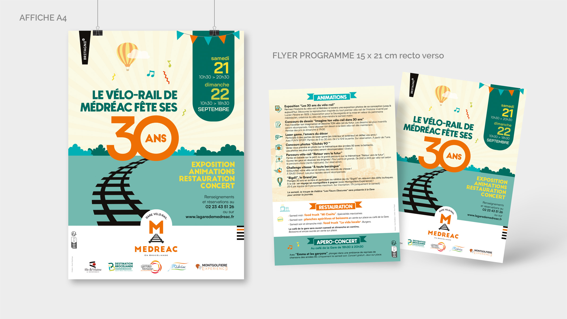 - Création de 9 panneaux photos et d’une frise de 2 panneaux pour les 30 ans du vélo-rail de Médréac